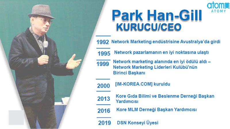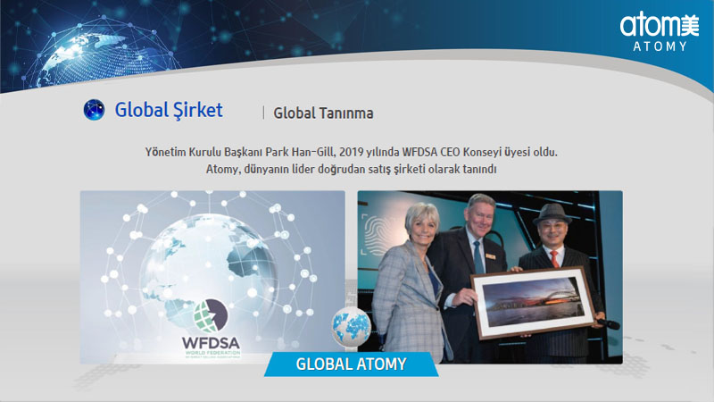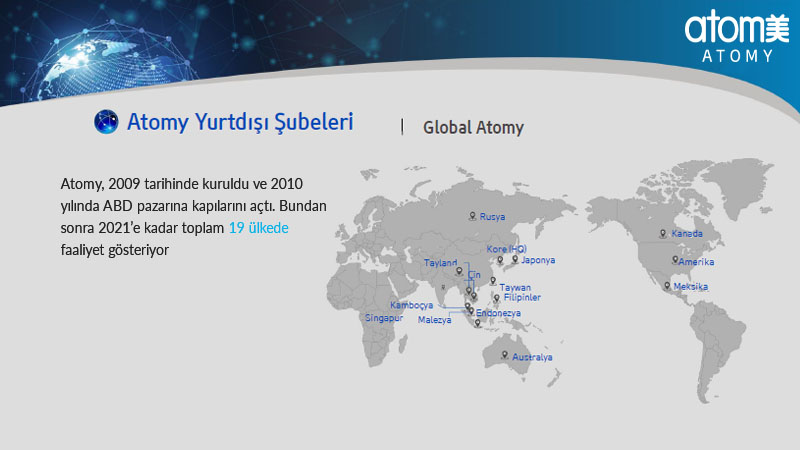 2009 yılında kurulan Atomy, Güney Kore dahil 19 farklı bölgede (Mart 2021 itibariyle) doğrudan satış yapan bir pazarlama ağı şirketidir. Kurucu Başkanımız Han-Gill Park'ın oluşturduğu Mutlak Kalite Mutlak Fiyat ilkelerine bağlı, tüketici odaklı bir strateji uygulayarak hızla büyüyoruz. Ayrıca, ileriye dönük müşteri başarısı hedefimize odaklanarak ve üç temel kurumsal kültürü teşvik ederek sürdürülebilir büyümenin temelini sağlamlaştırıyoruz: ilkelere uymak, birlikte büyümek ve paylaşmak. 2020 yılında Atomy'nin yıllık geliri 1,73 milyar USD oldu ve global üyelerimiz 15 milyona ulaştı.